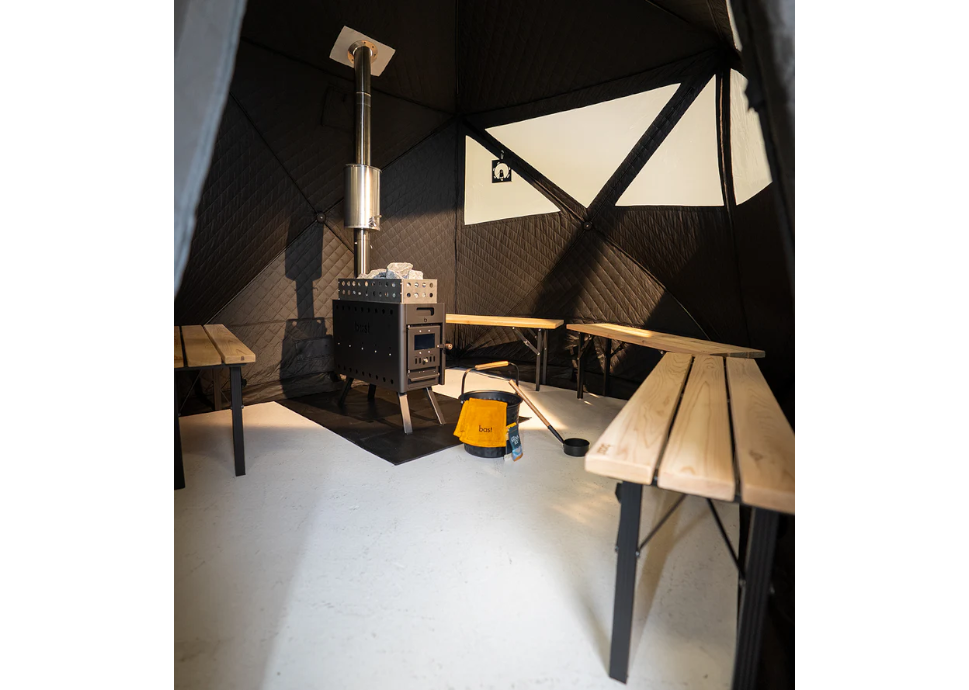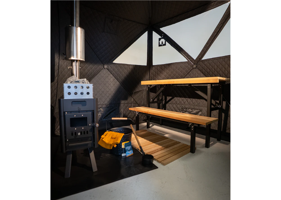 Unser Edelstahlkamin wurde speziell für Saunazelte entwickelt und sorgt für eine effiziente und gleichmäßige Wärmeverteilung. So entsteht im Inneren des Zeltes ein authentisches Saunaerlebnis mit Temperaturen von weit über 100 °C, unabhängig davon ob Sie im Garten, beim Camping oder in der freien Natur saunieren möchten. Die hochwertige Edelstahlkonstruktion macht den Kamin besonders robust und widerstandsfähig gegen Hitze, Feuchtigkeit und häufigen Einsatz. Mit seinem durchdachten Design vereint der mobile Saunaofen Funktionalität und Komfort. Der abnehmbare Schornstein lässt sich platzsparend im Inneren verstauen, während die stabilen einklappbaren Beine einen sicheren Stand garantieren. Seitliche Wärmeschutzelemente reduzieren die Strahlungswärme und erhöhen die Sicherheit beim Betrieb. Ergänzt wird dies durch ein großes Sichtfenster, das nicht nur für stimmungsvolle Atmosphäre sorgt, sondern auch den Feuerzustand jederzeit sichtbar macht. Der Kamin ist leicht zu transportieren, da alle Komponenten in einer langlebigen Tragetasche Platz finden. Mit nur wenigen Handgriffen ist er aufgebaut und einsatzbereit. Die Kombination aus hoher Heizleistung, einfacher Handhabung und kompakter Bauweise macht ihn zu einer idealen Lösung für alle, die Wert auf Flexibilität, Qualität und ein intensives Saunaerlebnis legen. Ob im eigenen Garten, am See oder auf Reisen, dieser Holzofen für Saunazelte bietet Ihnen jederzeit die Möglichkeit, Wellness auf höchstem Niveau zu genießen.